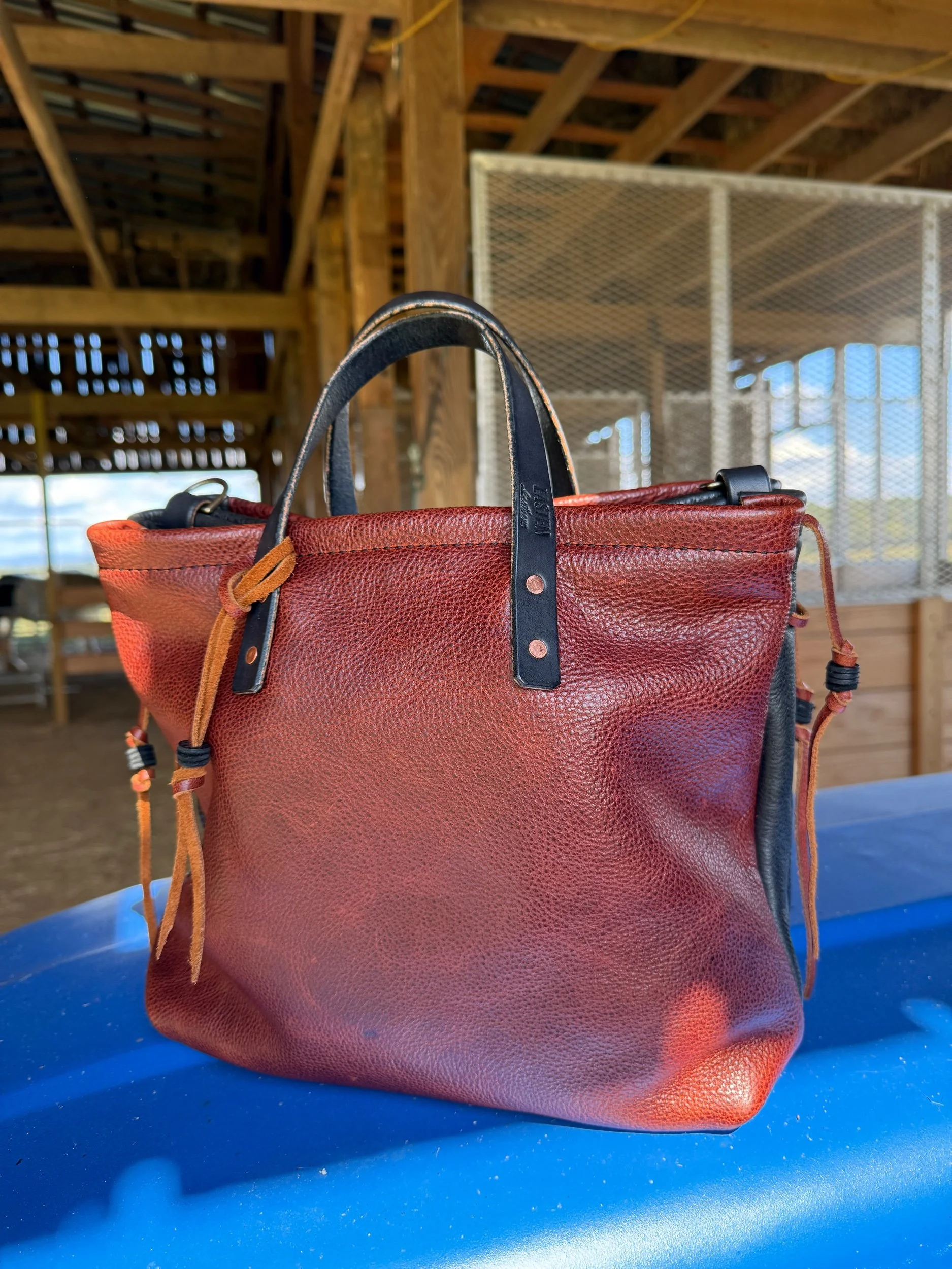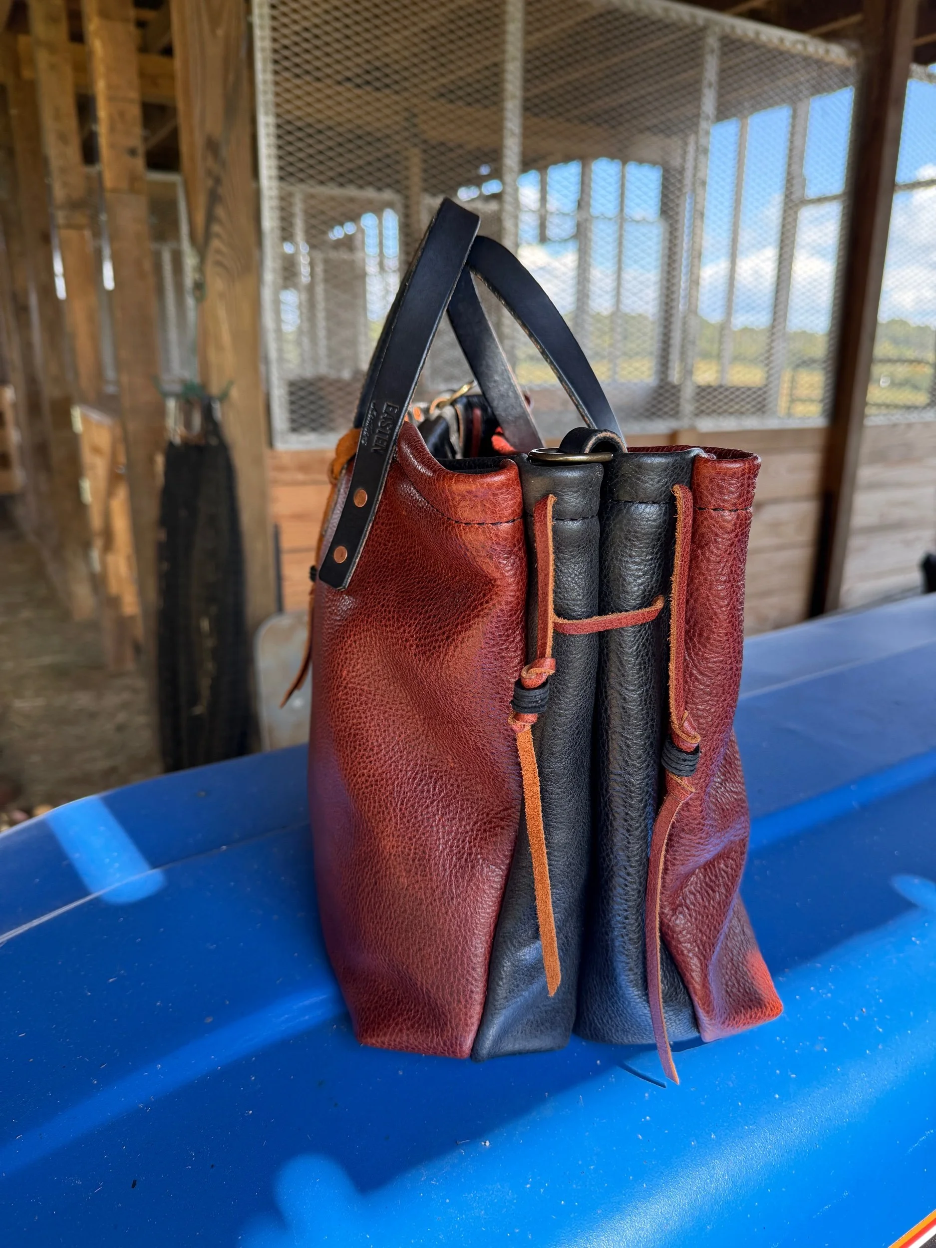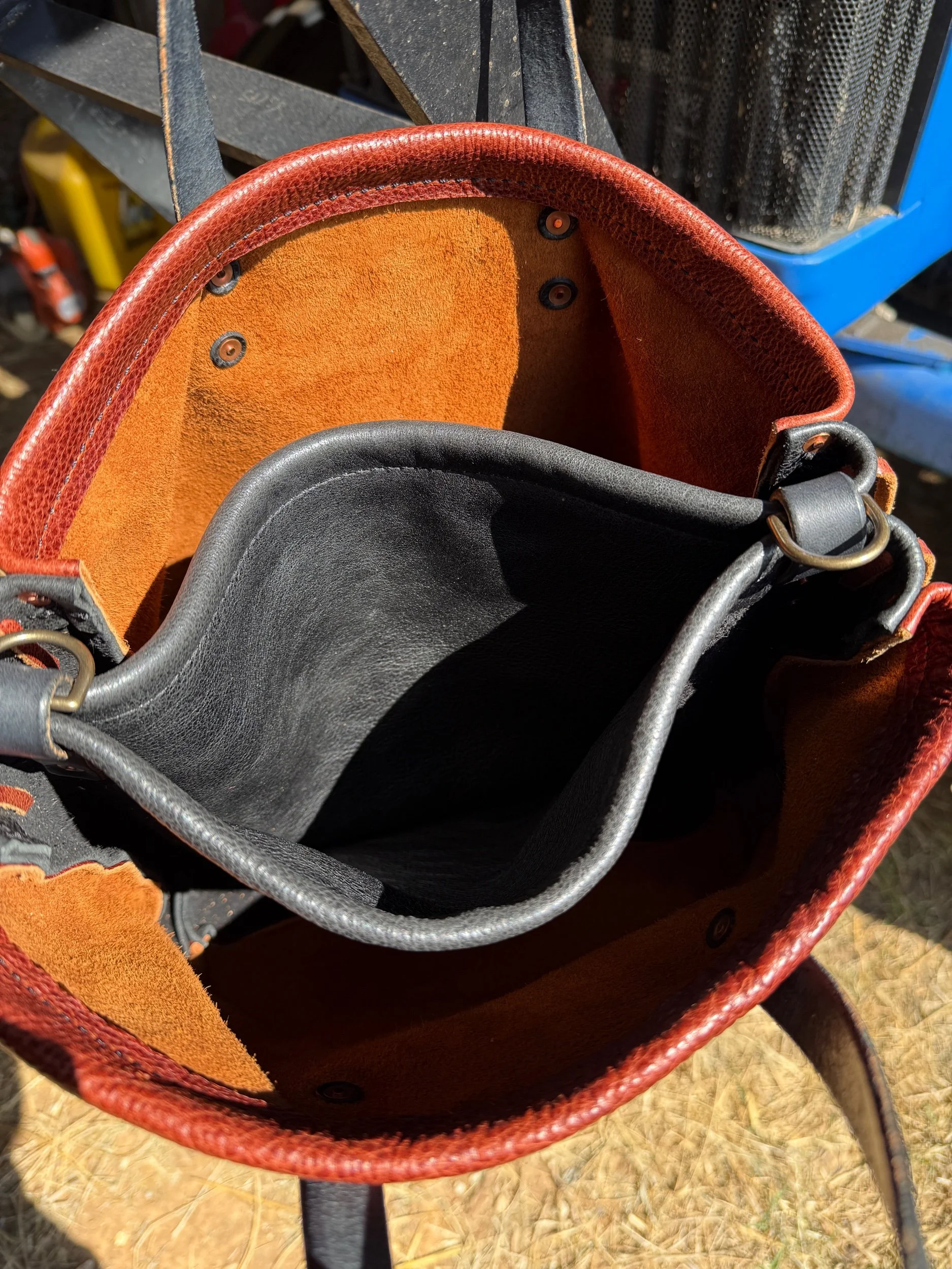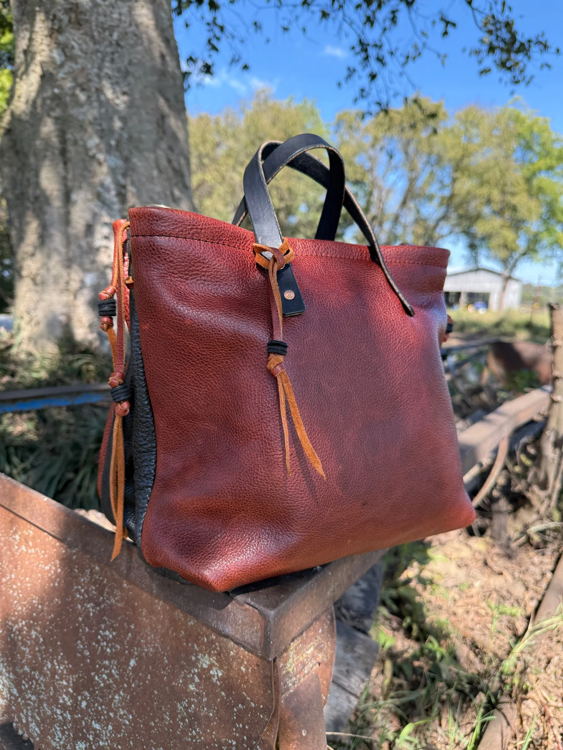 Exterior in cinnamon brown, interior black leather. Features corner antique brass D-rings for additional carry options.