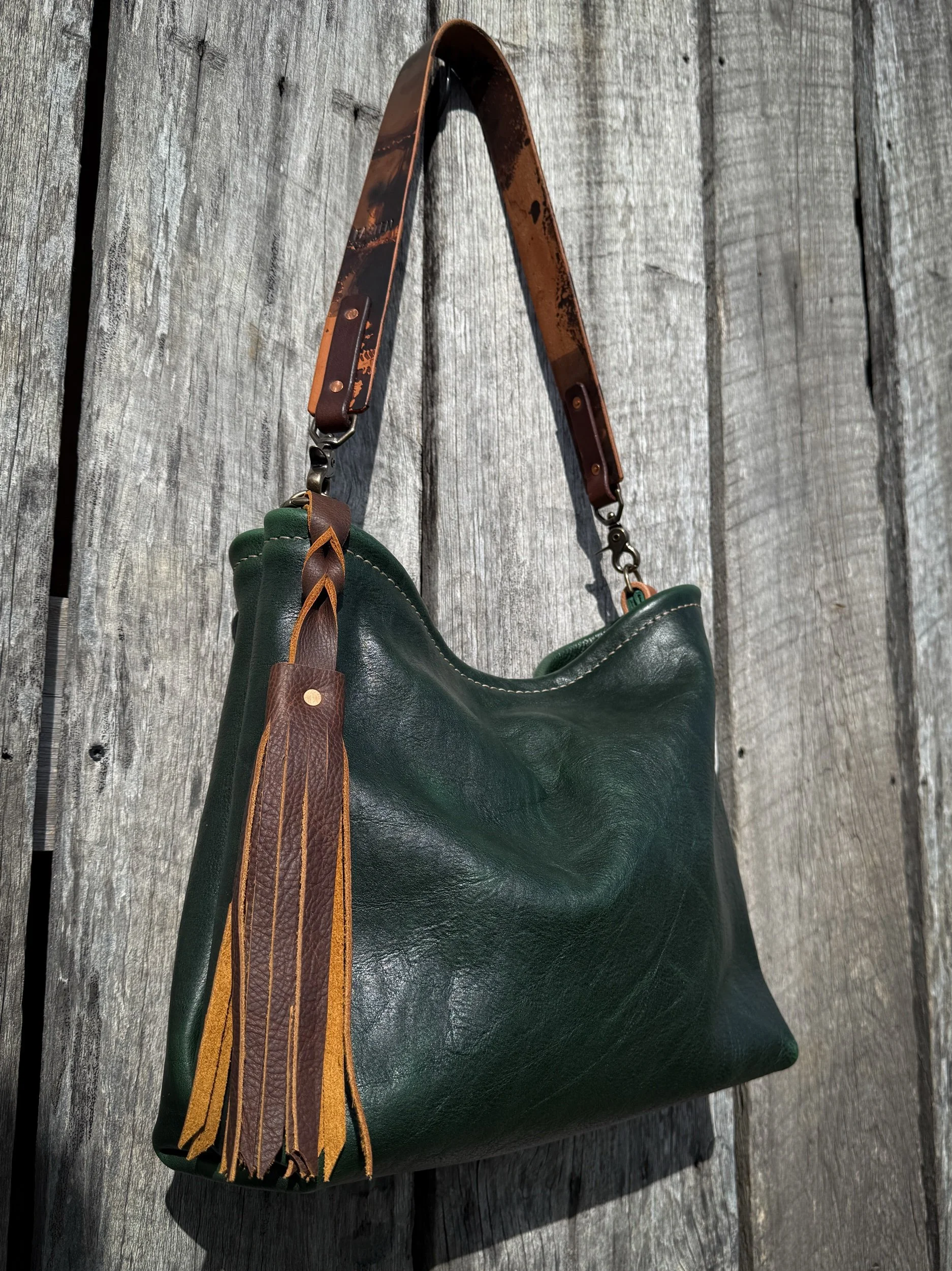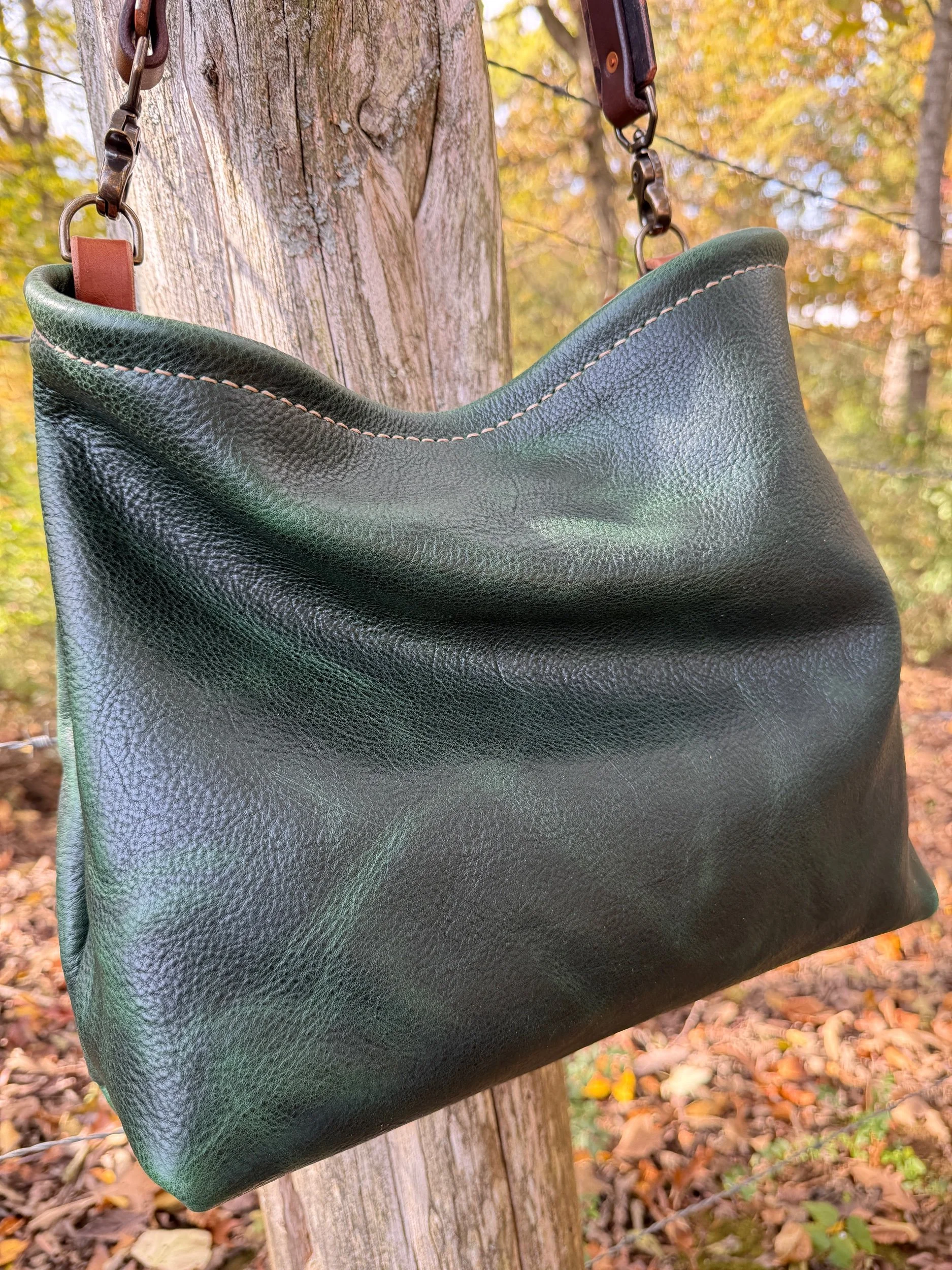 Forrest Green Bucket Bag with hand sewn top rolled edge in taupe colored thread.