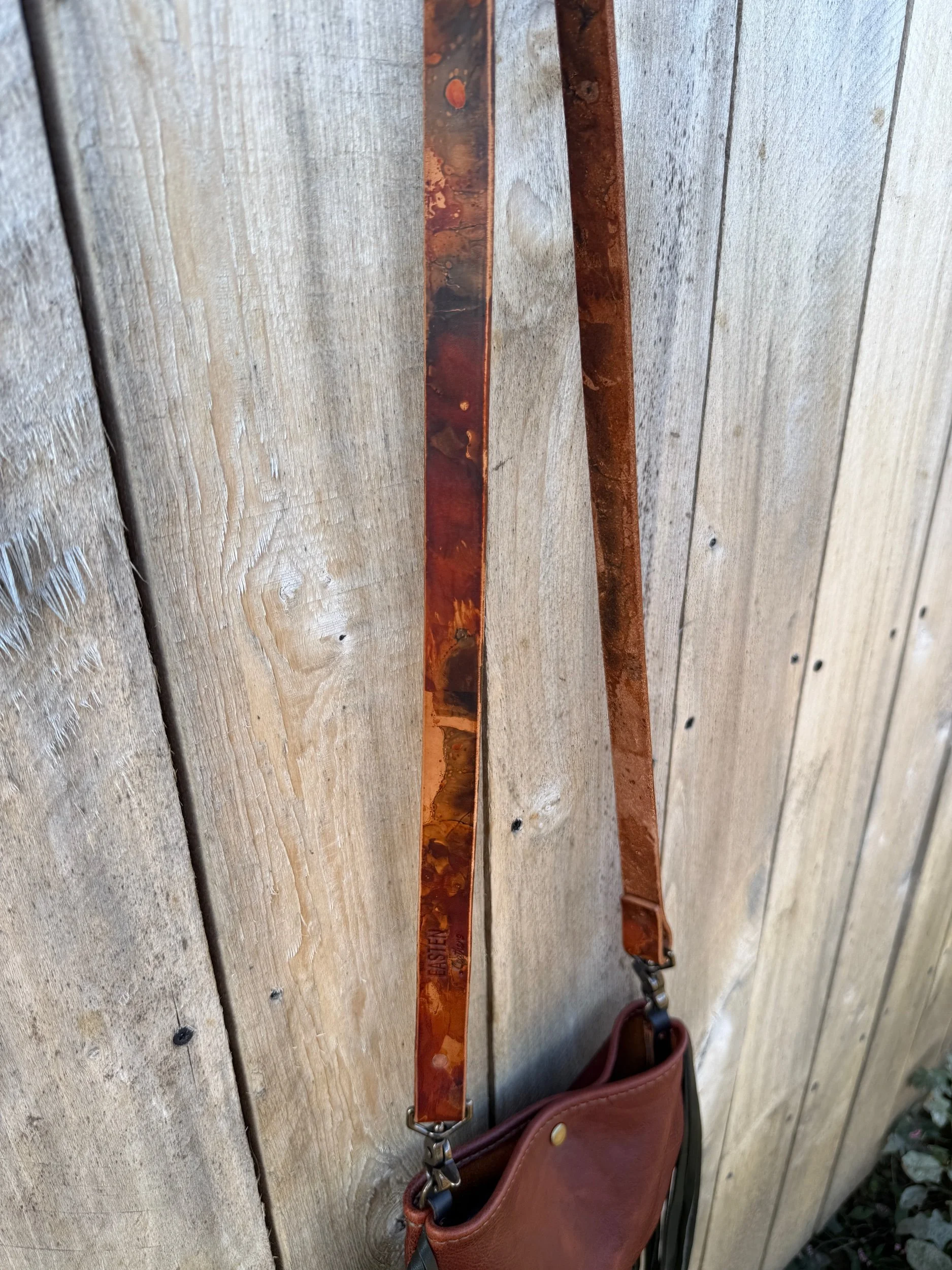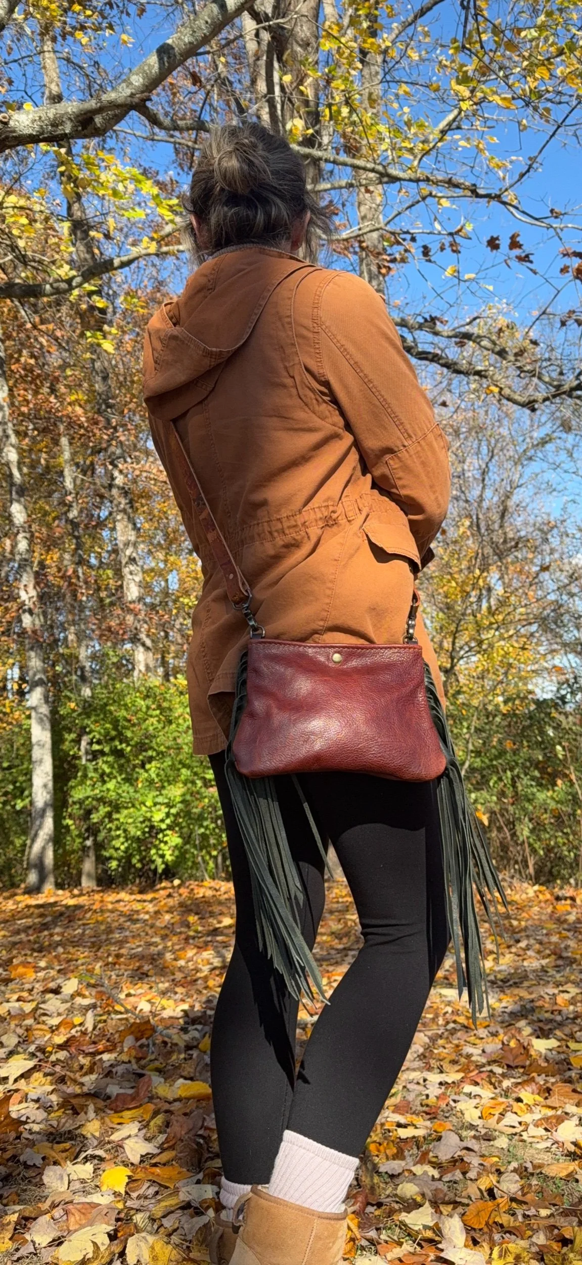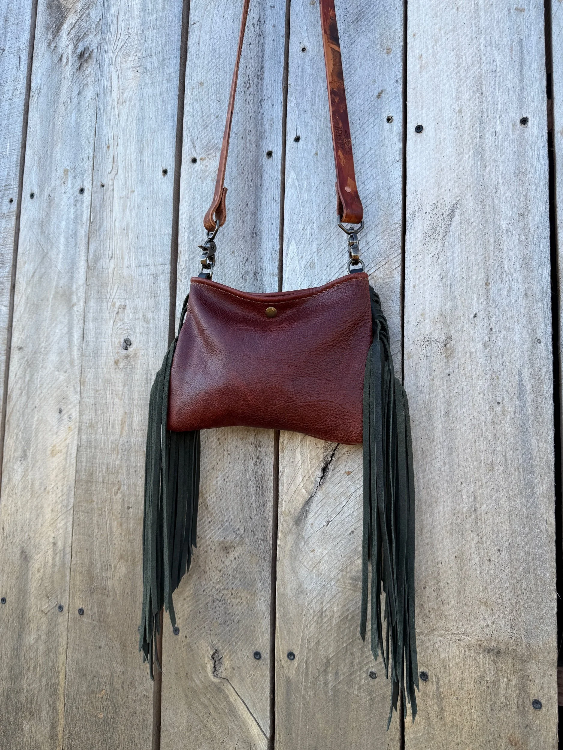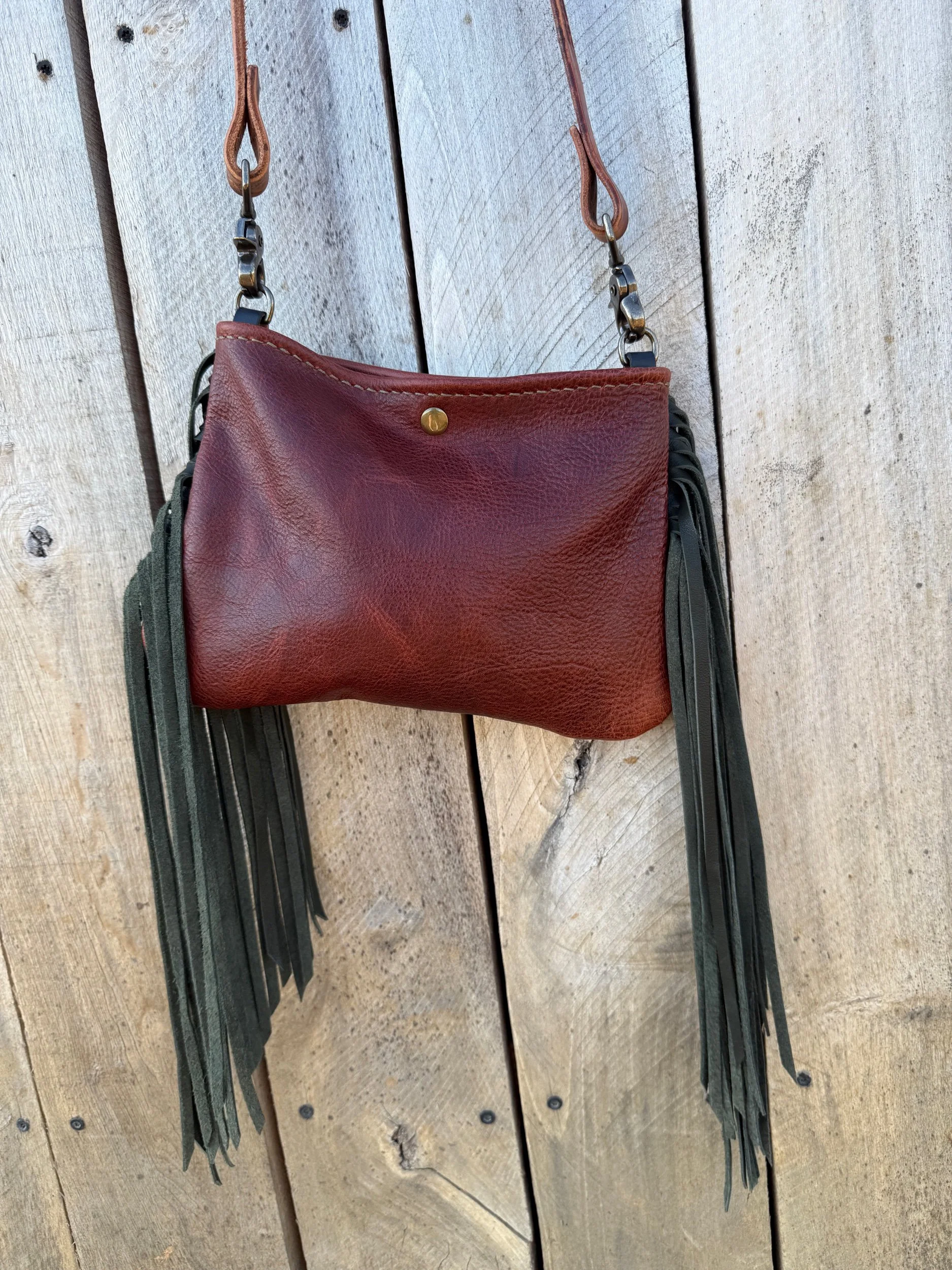 Small flat style design in Cinnamon Brown with soft green fringe.