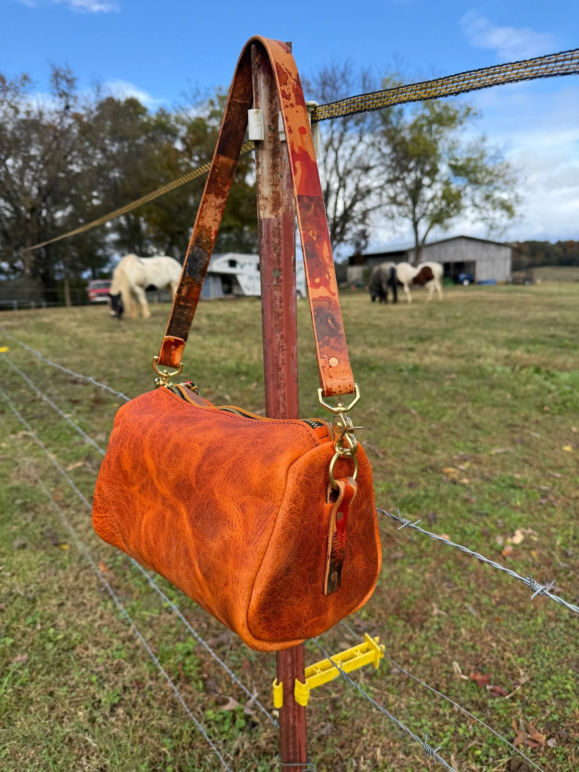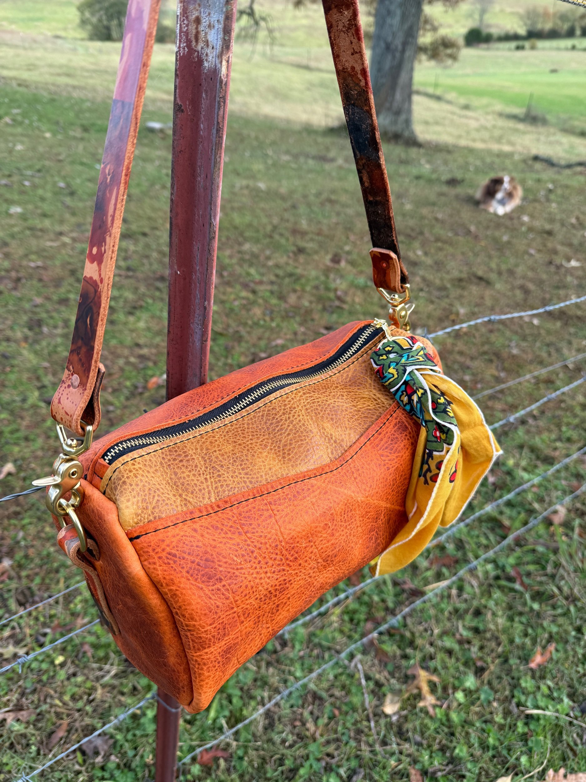 All natural brass hardware with vintage handkerchief on a hinged O-ring used as zipper pull.
