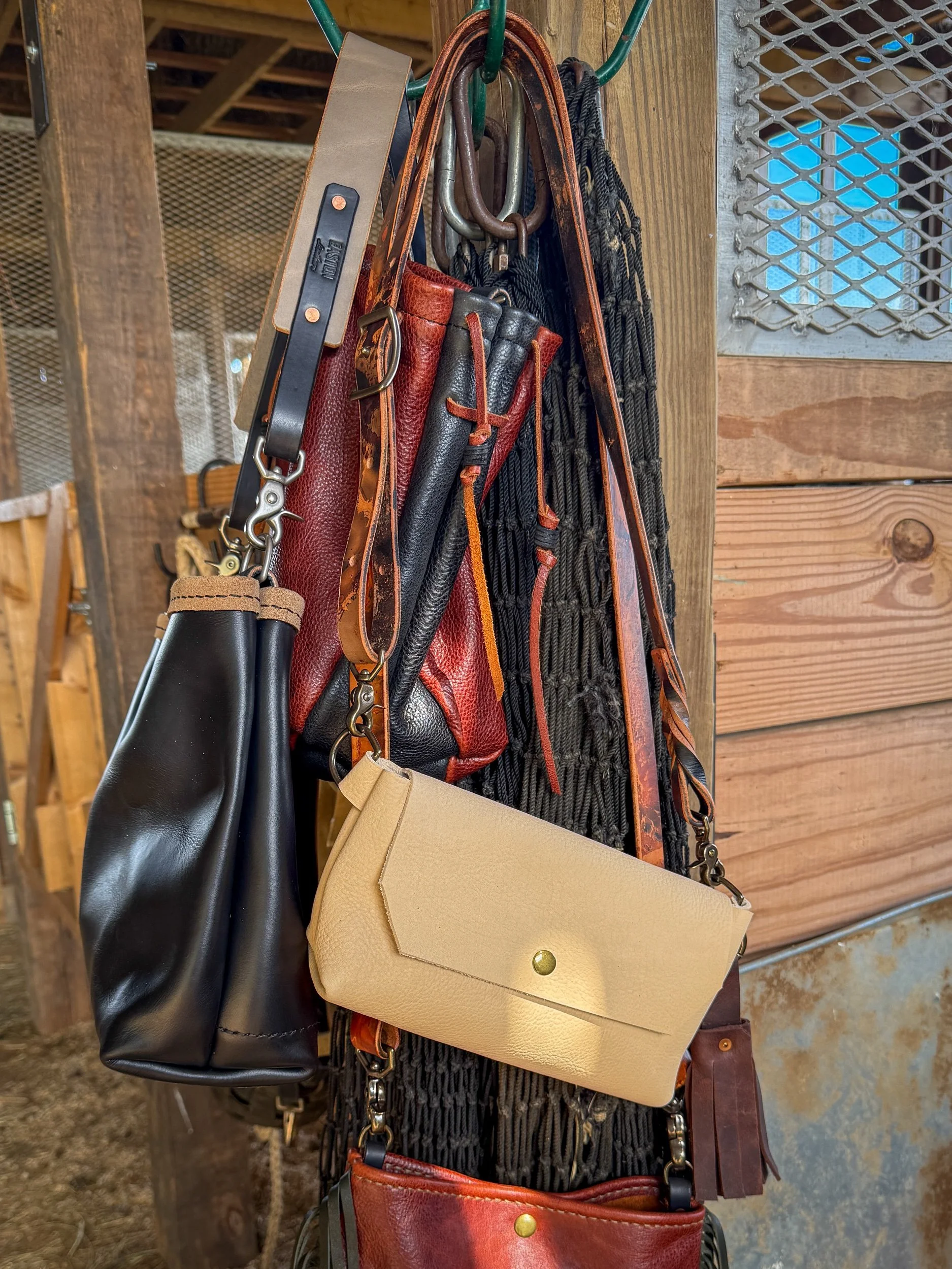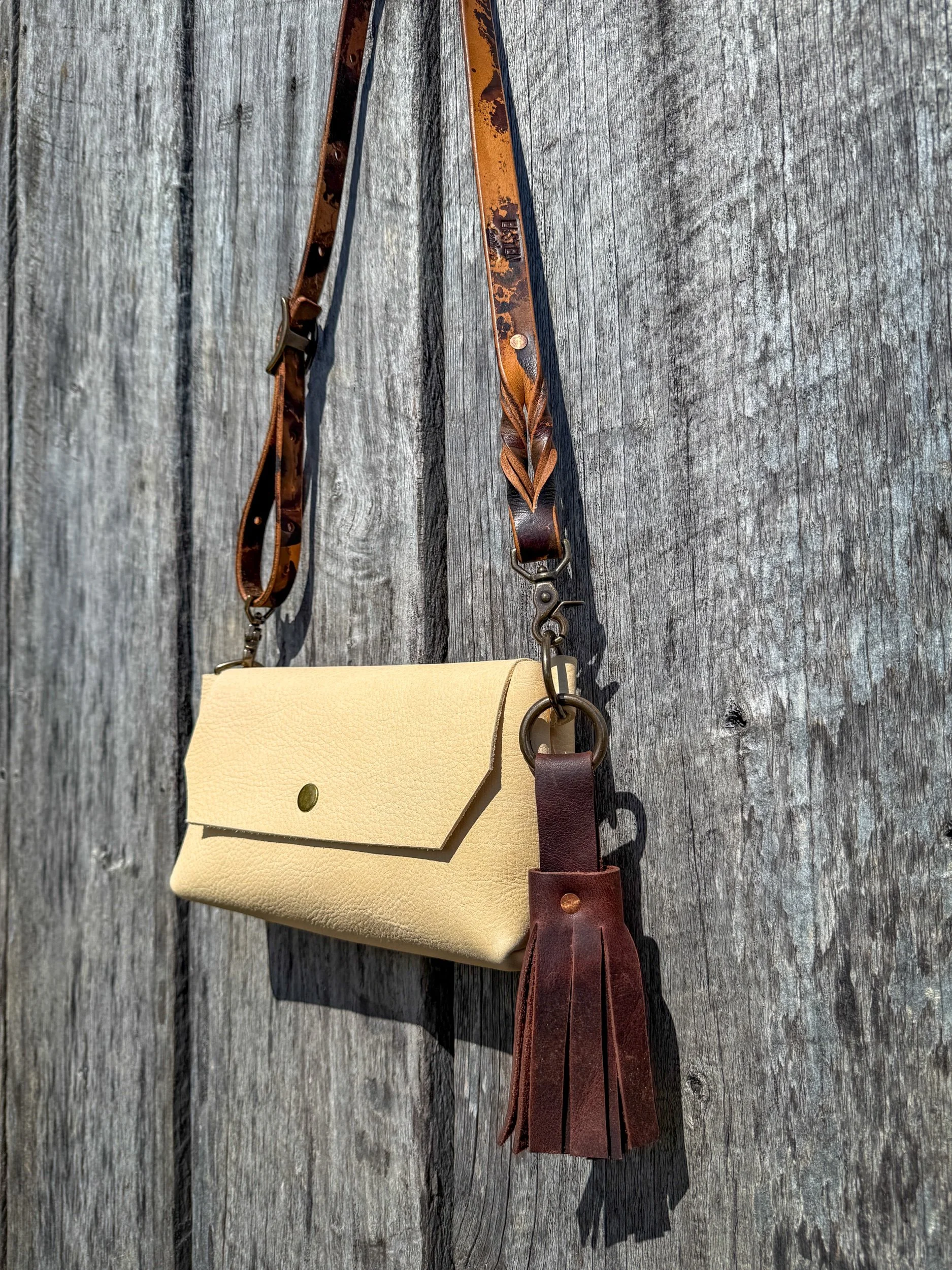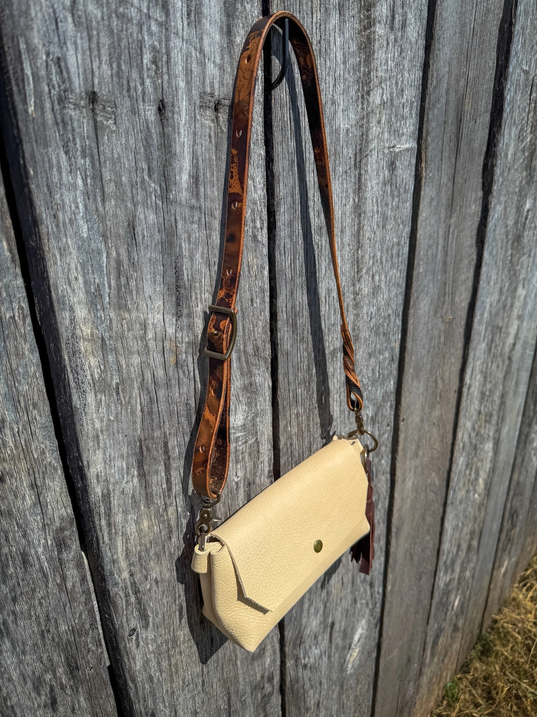Cream Horween leather with antique brass magnetic closure. (the interior of this leather has some dark marks from the tanning process)